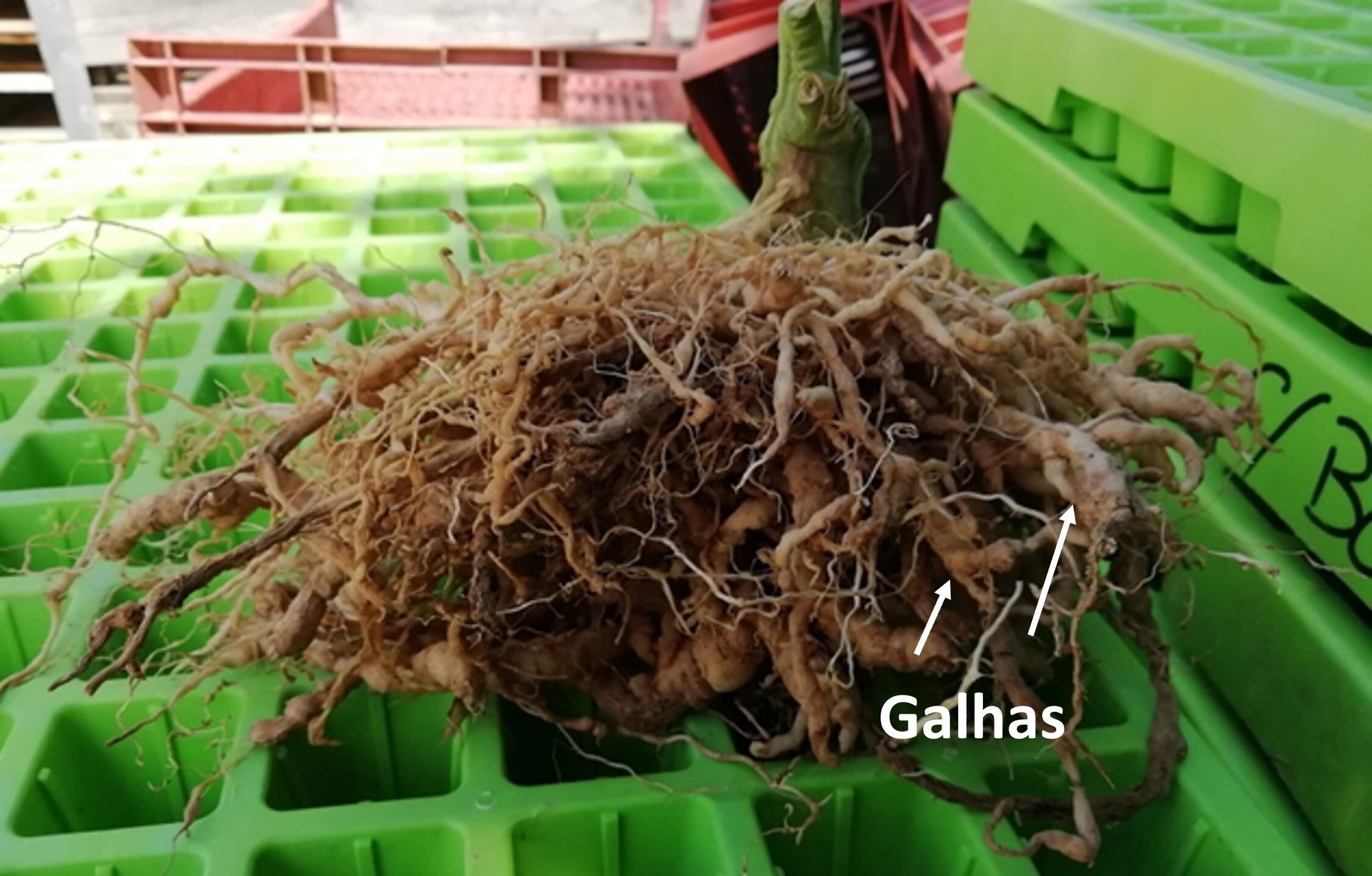 A espécie de NGR mais frequente e identificada em Portugal é M. incognita, mas, até ao momento e que se conheça, já foi reportada a presença das espécies M. arenaria, M. chitwoodi, M. enterolobii, M. hapla, M. hispanica, M. javanica, M. luci, M. lusitanica e M. naasi. Comumente, os sistemas radiculares de plantas infetadas por NGR apresentam típicas deformações sob a forma de galhas que podem ser visíveis a olho nu (Figura 1). Para além disso, podem apresentar menor crescimento, amarelecimento das folhas e murchidão (Figura 2).