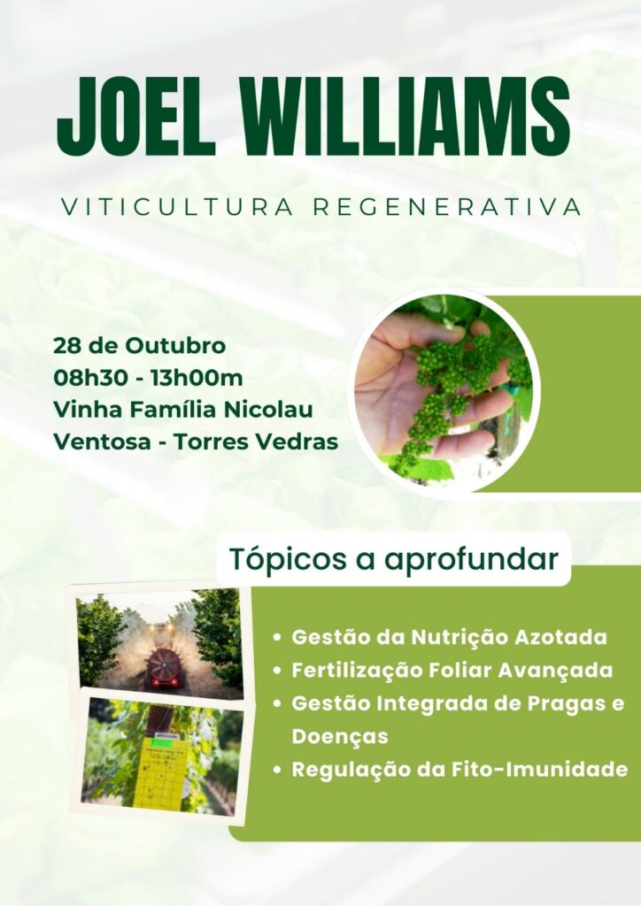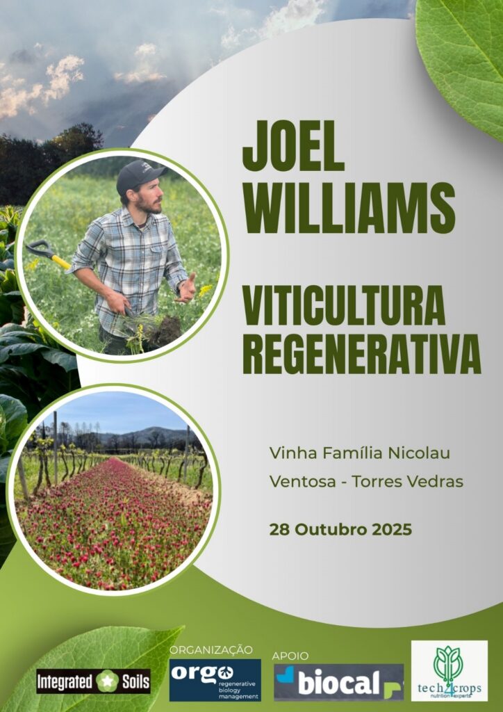 No próximo dia 28 de outubro, das 8h30 às 13h00, realiza-se, pela primeira vez em Portugal, uma formação única com o reconhecido consultor internacional Joel Williams, especialista em viticultura regenerativa.