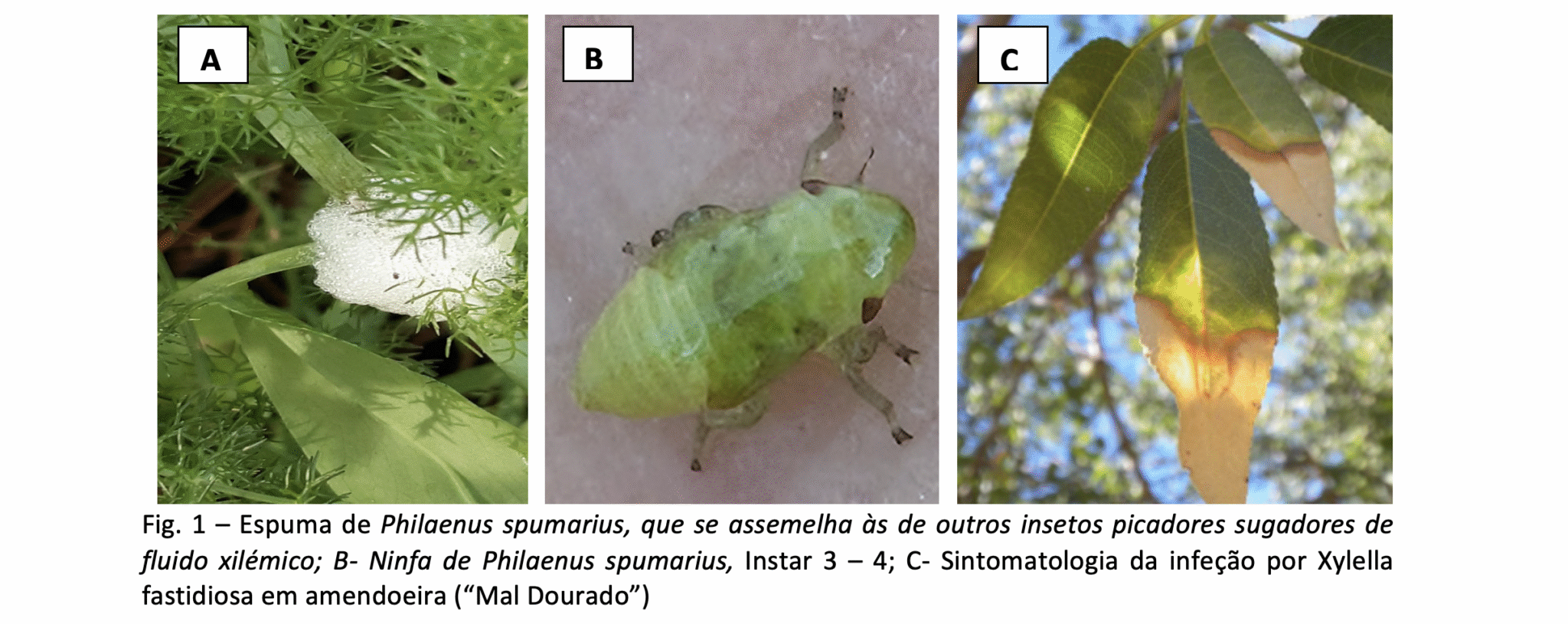 A deteção da Xylella fastidiosa em Apúlia (Itália), em 2013, marcou o início de uma crise sem precedentes para a olivicultura mediterrânica. Desde então, a bactéria foi detetada em França, Espanha e Portugal, evidenciando uma grande capacidade de adaptação. É transmitida sobretudo pela cigarrinha-vulgar Philaenus spumarius, no seu processo de alimentação. A bactéria coloniza o xilema das plantas, onde forma biofilmes que comprometem o transporte de água e nutrientes (Fig. 1). Os prejuízos económicos são alarmantes: apenas para Itália estimam-se 5,2 mil milhões de euros em 50 anos, podendo atingir globalmente 5,5 mil milhões por ano na Europa [4]. A ausência de tratamento curativo exige soluções inovadoras, articuladas entre genética, biocontrolo, práticas agrícolas e políticas públicas.