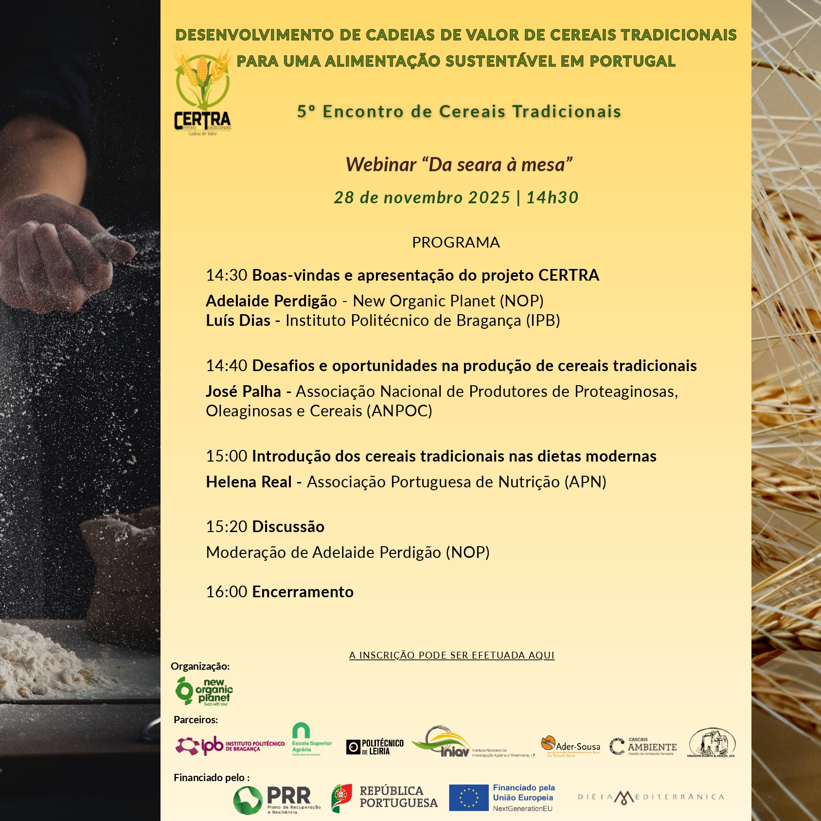 No âmbito do Projeto CERTRA – Desenvolvimento de Cadeias de Valor de Cereais Tradicionais para uma Alimentação Sustentável em Portugal, Linha de ação 1.4 Comunicação – Projeto PRR-C05-I03-i-000161 LA 1.4 divulga-se o Webinar “5º Encontro de Cereais Tradicionais: Da seara à mesa”, que se irá realizar-se no dia 28 de novembro às 14:30 horas, na plataforma Zoom.