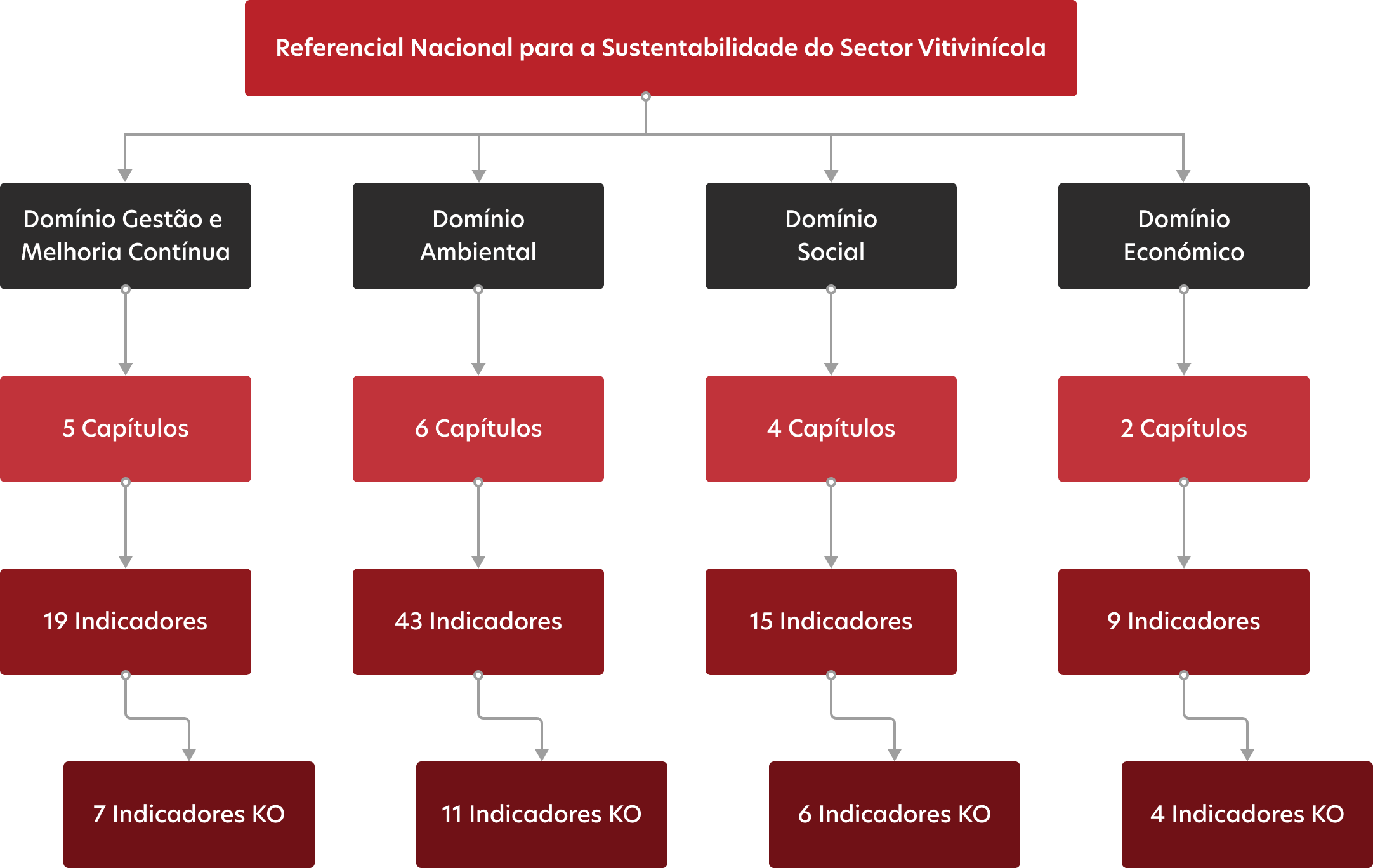 O Referencial Nacional de Certificação de Sustentabilidade do Setor Vitivinícola tem um conjunto de indicadores (86), dos quais 28 são indicadores “KO”, organizados em capítulos (17) e distribuídos pelos 4 Domínios de Intervenção.