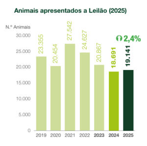 Entre 2018 e 2021 o aumento foi progressivo e estável, e a partir de 2022 verifica-se uma aceleração, com aumentos mais expressivos, reforçando a importância dos Leilões APORMOR como canal de comercialização de animais vivos.